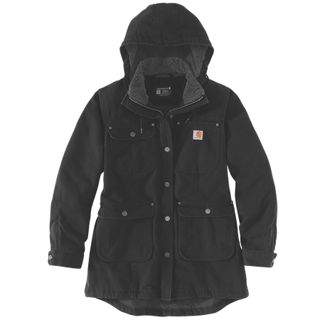 Als het werk niet op warmer weer wacht, trek dan deze verweerde eendjas voor dames aan. Isolatie van arctisch gewicht en een met sherpa gevoerde kraag houden je warm in de schuur of op de bouwplaats. De losse pasvorm past de hele winter goed over truien en zware truien, en een gewatteerde nylon voering zorgt ervoor dat je hem gemakkelijk aan en uit kunt trekken. Draag hem met of zonder capuchon.
